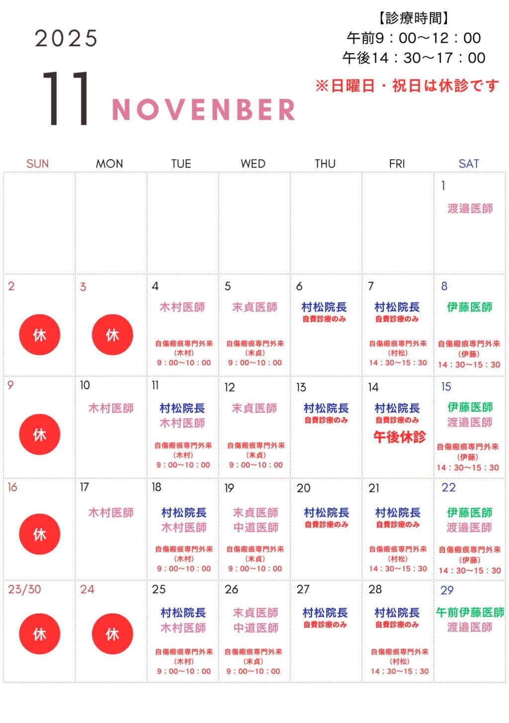 豊洲院11月診療スケジュール | きずときずあとのクリニック 豊洲院・銀座院 | 東京都江東区・中央区の形成外科・美容外科