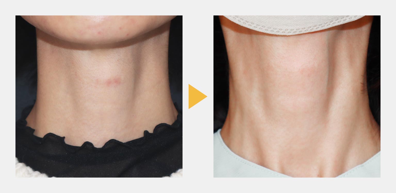 頸部の傷跡では、隆起が落ち着いた後も色調異常が長期に残存するケースが少なくありません。本症例のように、瘢痕の状態を正確に評価し、形態と色調を分けて治療戦略を立てることで、満足度の高い結果につながります。