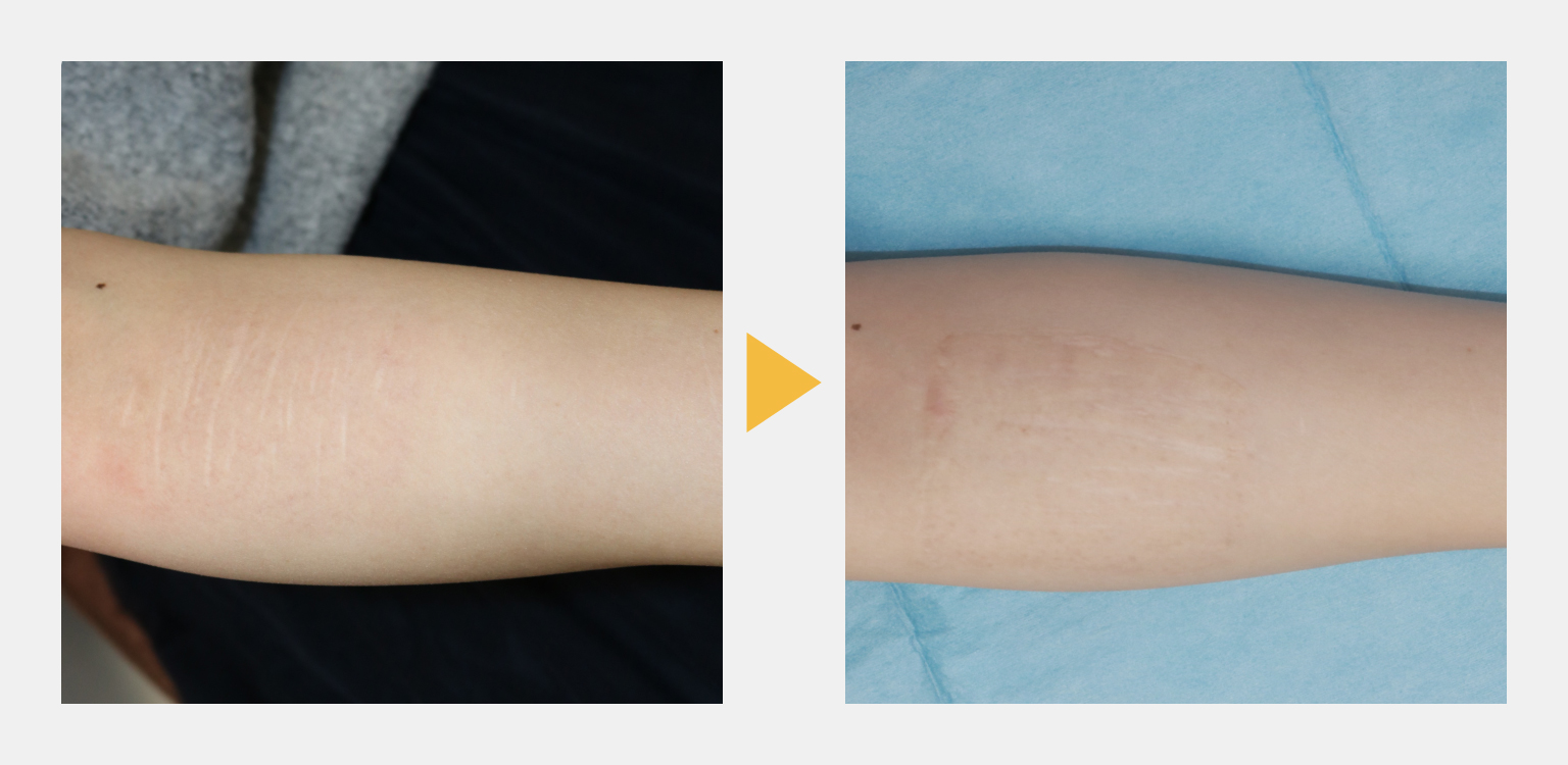 本症例は20代女性の日本人患者です。10代半ばに自傷行為を行い、前腕に複数のリストカット痕が残存していました。受傷から10年以上が経過しており、瘢痕は成熟瘢痕の状態でした。1年前より他院にてフラクショナルレーザー治療を繰り返し受けており、治療回数は約10回に及んでいましたが、十分な改善が得られないとのことで当院を受診されました。
