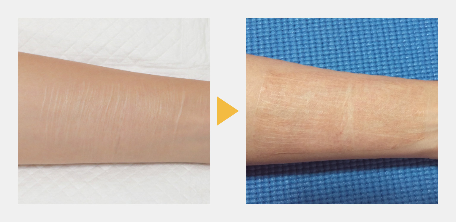 本症例は30代女性の方です。20代前半にカッターやカミソリによる自傷行為を行い、その後長期間にわたりリストカット痕に悩まれていました。傷跡自体の見た目に加え、結婚を機に妊娠を希望されるようになり、「将来子どもに対してこの傷跡をどのように説明すればよいのか」という点が大きな心理的負担となり、当院を受診されました。