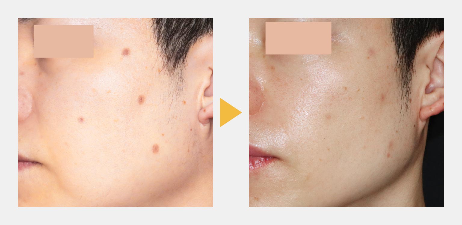 電気メスによるほくろ除去後に残った赤みと陥凹に対し、外用で経過観察後、ポテンザを4回施行。炎症を抑えつつ真皮再生を促し、赤みと凹みの改善が得られました。
